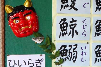 給食室前の掲示板にも,いわしの頭をさしたひいらぎをかざりました。
