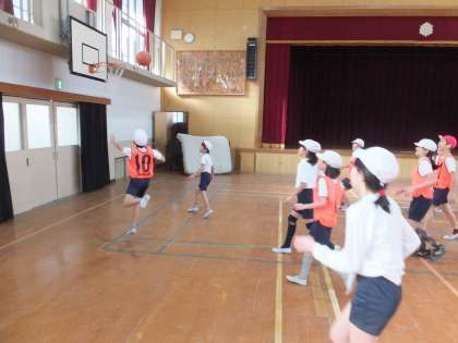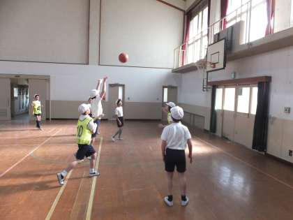 5年生のバスケットボールの学習が進んでいます。班ごとに攻め方や守り方,パスのつなぎ方の作戦を立てて試合に臨んでいます。