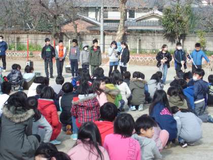 2月7日の中間休みに「大なわ記録会」がありました。各クラスとも練習の記録をこえようと,一生懸命にチャレンジしていました。失敗しても「ドンマイ!」とあたたかい声が飛び交っていました。