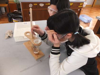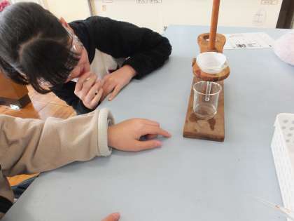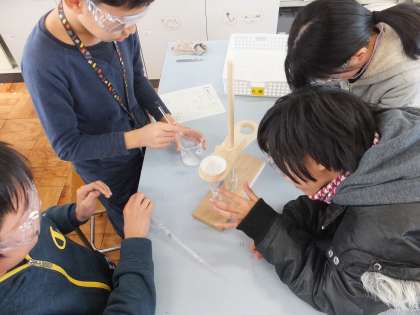 5年生の理科の学習でもののとけ方の学習が進んでいます。この日はホウ酸の水溶液を使って,溶けたものを取りだす実験を行いました。子ども達は,熱して水の量を減らしたり,冷やしたりすると溶けたものを取りだすことができるのではないかと言う予想を立てました。