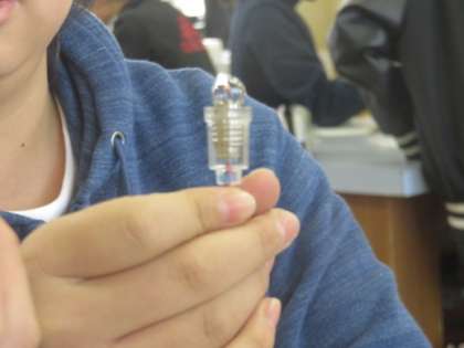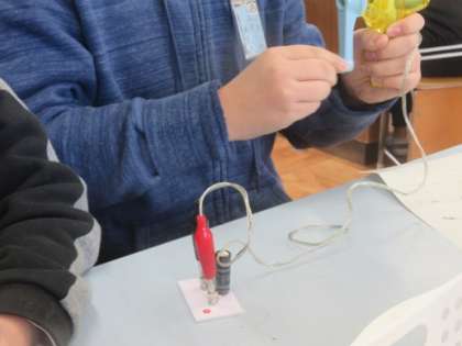 コンデンサーにためた電気は,かん電池などの電気と同じようなはたらきをするのか考えました。手回し発電機は,速く回しすぎないように注意し,コンデンサーに電気を蓄えました。コンデンサーにためた電気を使うと豆電球に明かりがつきました。