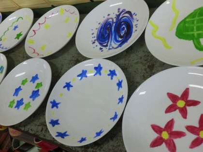 それぞれが思いをこめて,白いお皿に模様を描き入れ