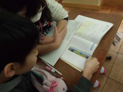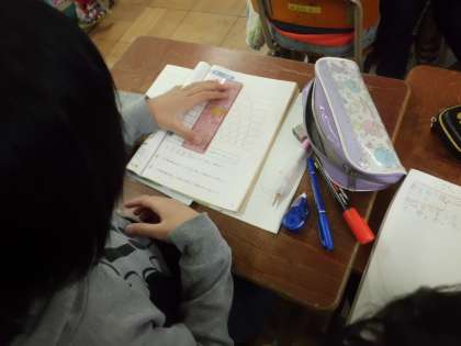 算数科「分数」では,分母のちがう分数でも同じ大きさの分数があることに気づいた子どもたち。数直線に定規を当て,同じ大きさの分数を探し出しました。