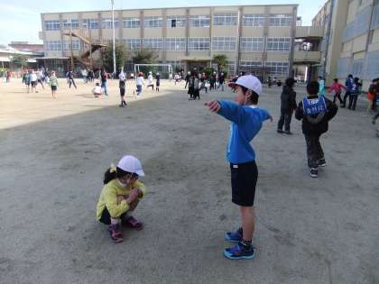 おにが石と言ってタッチするとかがんで石のようにかたまり,おにが木と言ってタッチすると木のようなポーズでかたまり,おにがバナナというとバナナのようにかたまるというおにごっこです。