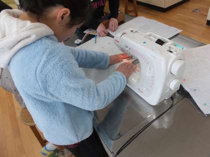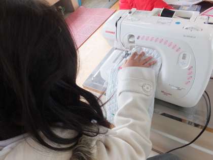 家庭科の学習で,ナップサック作りに取り組んでいます。しるしをつけたり,まち針を刺したりと前回の学習を生かして作業を進めていきました。