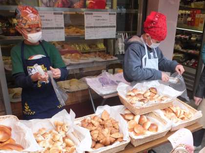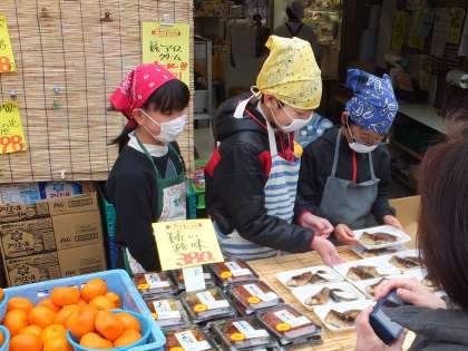 販売体験が始まりました。お店の前を通りかかる方々に,「いらっしゃいませ!」「○○はいかがですか!」と元気よく売り込みをする子ども達。買ってもらった後には,「お買い上げありがとうございました。」とあいさつもしっかりできていました。