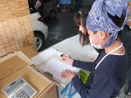約2時間ほどの販売体験を終えた子ども達。大きな声で呼び込みをしたり,立って店番をしたりと,ずいぶん疲れもあった様子でしたが,最後まで仕事を頑張っていました。最後は集計をして,商品と売上があっているかを確認しました。自分たちの頑張りが売上という形に現れて,達成感を味わえた子どもたちでした。
