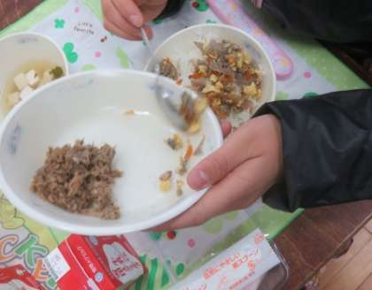 3月3日はひな祭りです。この日の給食は行事献立で,ごはん,牛乳,ちらしずしの具,さばそぼろ,みつばのすまし汁,三色ゼリーでした。ちらしずしの具はご飯に混ぜで,さばそぼろは,ご飯にのせてたべました。