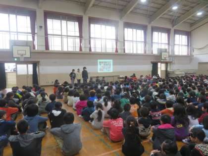朝会で緑化委員鹿の発表がありました。花に関するクイズをしたり,ねじり草などの植物に関わる話をしたりしていました。