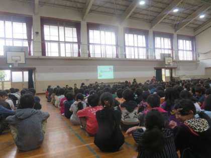朝会で企画委員,代表委員の6年生があいさつ運動の取組の発表をしました。あいさつ運動で頑張っていたところやこれから頑張ってほしい所,また各学年から書いてもらった挨拶の木についての発表でした。毎日,挨拶の声が響いています。
