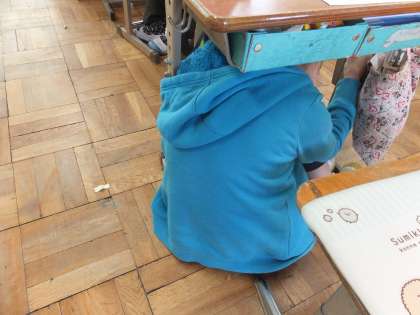 3月10日(金)シェイクアウト訓練を行いました。地震が起きた時に,まず自分の身を守るために机の下に隠れるという訓練を行いました。自分の命や友だちの命を守るために,真剣に取り組む子どもたちでした。