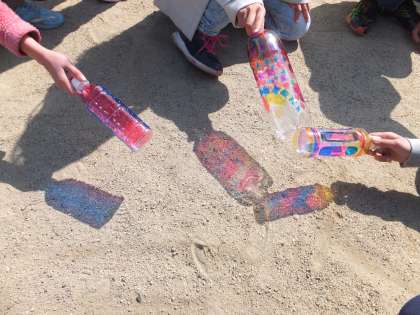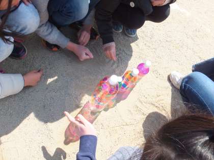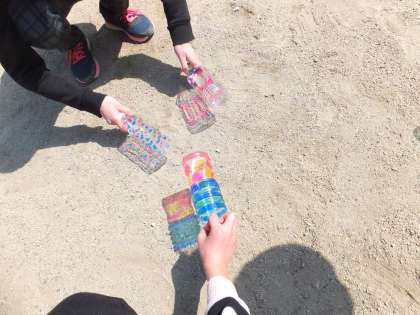 図画工作科で「光のハーモニー」の学習に取り組みました。ペットボトルにマジックで思い思いの柄や模様を描き,日光にかざしてみると,地面に鮮やかな色が映し出されました。少し水を入れたり,ペットボトルを重ねてかざすことで,様々な見え方になりました。子ども達も想像以上の映り具合に,感動していました。
