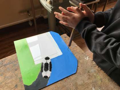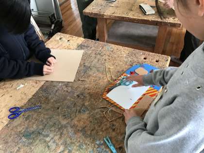 図画工作科の学習で取り組んでいる伝言板づくりが完成に近づいています。自分の好きなスポーツや動物など,それぞれの思いが詰まった良い作品になっています。ニスが乾いたので,コルクを貼ったり,穴をあけてひもを通したりして完成です。