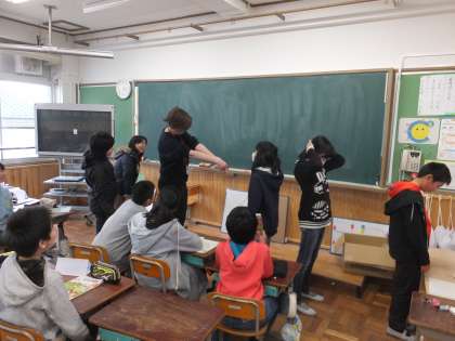 3月14日(火)今年1年お世話になったALTのキャサリン先生と,今年度最後の英語活動を行いました。英語でのクイズを出し合ったり,ジェスチャーゲームで様々な表現をしたり,楽しく英語に慣れ親しむことができました。