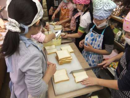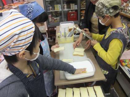 ラスクの作り方を聞いて,実際にパンを切って,バターと砂糖をぬりました。