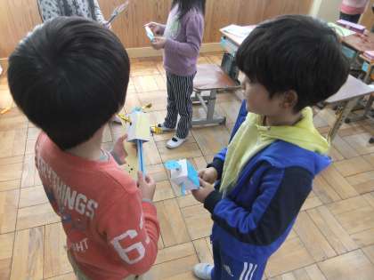 作ったおもちゃを友だちと交流し合い,お互いのしかけを紹介し合いました。