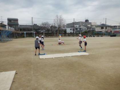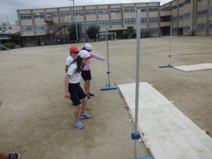 体育科では走り高跳びの学習がスタート。グループで協力して学習を進めています。はさみとびのようなとび方にチャレンジ中!