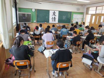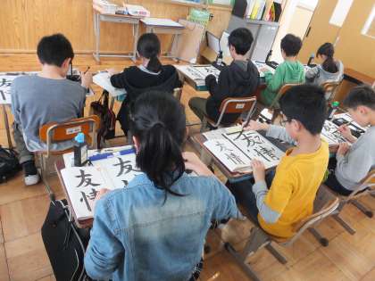 6年生の毛筆の学習で,「友情」を書きました。「友」の字は,はらいの方向や文字のバランスに気をつけて,「情」の字は,へんとつくりの幅のバランスを考えて書きました。