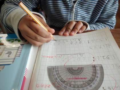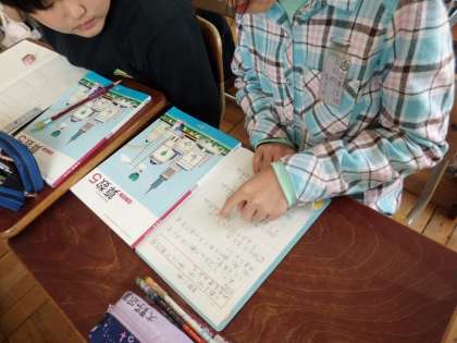 算数科では「整数と小数」の学習がスタート。小数を10倍,100倍,1000倍すると,小数点がどのように動くのか,ノートに書いた意見を指さしながら,説明していきました。