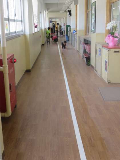 3年生は,職員室前の廊下を掃除をしています。職員室前の廊下はとても長いです。子ども達はその長い廊下をきれいにしようと頑張っています。廊下は,ピカピカです。
