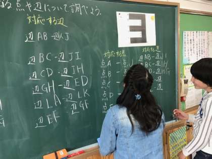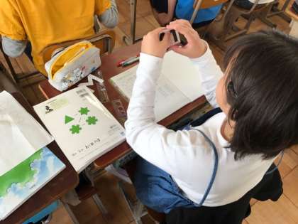 算数科の学習で,対称な図形に取り組んでいます。この日は,線対称な図形の性質について調べ,対応する点や辺について調べました。図形を折って,どの点とどの点が対応するのかを繰り返し確かめる中で,図形のイメージを膨らませることができました。線対称や対称の軸といった言葉もしっかり覚えていきたいと思います。