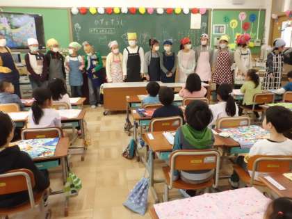 6年生のお兄さん・お姉さんが,給食当番の仕方を毎日教えてくれます。エプロンの着方やたたみ方,配膳の仕方など優しく丁寧に教えてくれるお兄さん・お姉さん。おかげで1年生の子どもたちも上手に当番活動ができるようになってきました。給食の用意が整って教室に帰るお兄さん・お姉さんに「ありがとう」と手を振る1年生。なんとも言えない温かい幸せな空気が流れます。