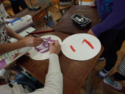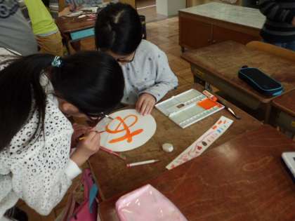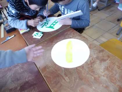 自分たちで決めた学級目標を教室に掲示するために,1文字ずつ絵の具で画用紙にかいていきました。ここでもみんなでささえあう場面が見られました。