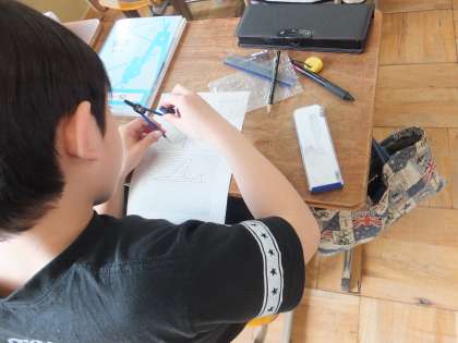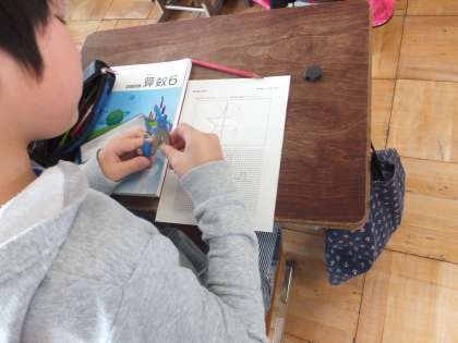 算数科の学習で,線対称な図形について取り組んでいます。この日の学習では,対応する点を結ぶ直線と対称の軸は垂直に交わることと,その交わる点から対応するそれぞれの点までの長さが等しいことを生かして図形をかいていきました。コンパスや三角定規などを使って,正確にかけるように頑張りました。