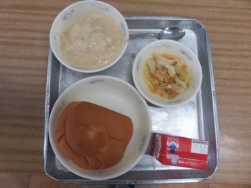 今日の給食は,バターうずまきパン,牛乳,じゃがいものクリームシチュー,ツナとキャベツのソテーでした。「今日の給食は何かな?」「今日の給食は,〜だよ」など給食に関することを話しています。子ども達は,毎日給食を楽しみにしています。