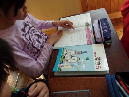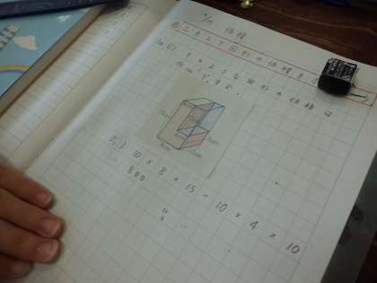 算数科「体積」では,複合図形の体積を求める学習をしました。どのように求めたのかノートにまとめ,ペアで交流。その後,全体での話し合いを通して,図形を区切ったり,つけ足したりすることで,体積が求めやすくなるとまとめることができました。