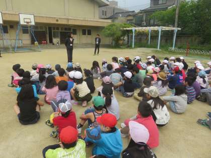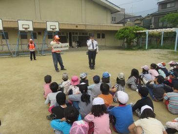 運動場で自転車教室を行いました。最初に,南警察署と地域の方に自転車の乗り方を教えてもらいました。そして,普段乗っている自転車は,車の仲間という話を聞きました。