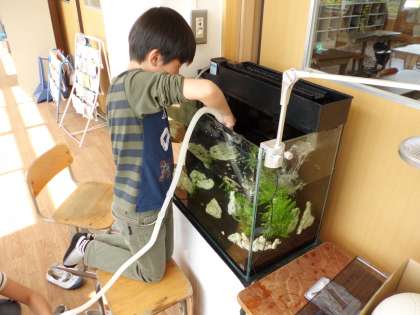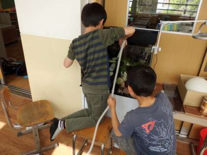 飼育係の子どもたちが大切に育てている魚の水かえを