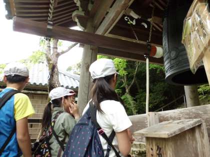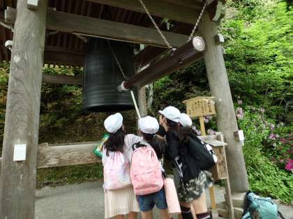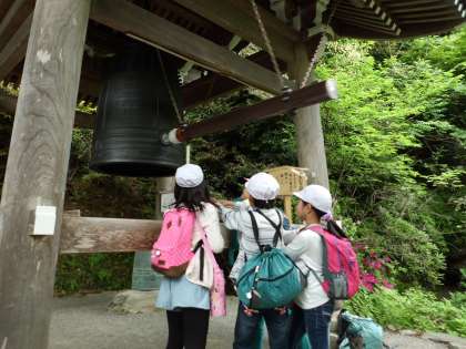 5月9日(火)の遠足では,嵯峨嵐山ウォークラリーに挑戦しました。二尊院に到着したグループはしあわせの鐘をグループで協力してつきました。