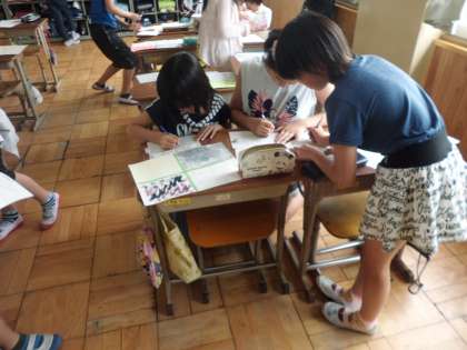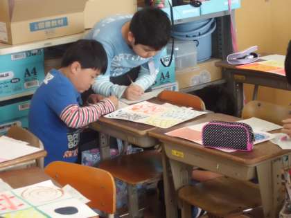 図画工作科で取り組んだ「心のもよう」の作品の鑑賞会をしました。色や濃さ,形などに注目して,友だちの作品を鑑賞しました。自分の表し方との違いを楽しむ子どもたちでした。