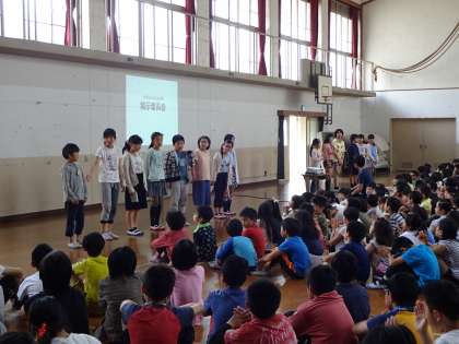 月曜日の1時間目に朝会が行われ,英語活動と掲示委員会の発表でした。
