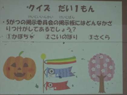掲示委員会からは,学校の掲示板にどんな飾りがあるのかクイズをして楽しみました。委員会の人が協力して作った掲示物は,季節の変化を感じれるものもたくさんありました。
