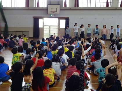 毎週火曜日はイングリッシュデイがあり,色々な英語の単語を使ってゲームや歌で楽しんでいます。朝会でも知っている単語がいくつか出てきて,みんなで楽しく発音していました。