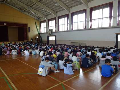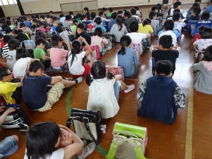 体育館で待機していた子どもたちは,ランドセルを置いてきちんと整列し,静かに待つことができました。大変すばらしかったです。