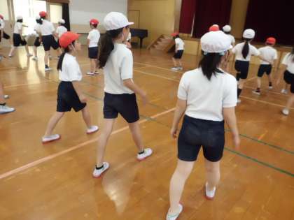 運動会の練習が始まりました。4年生はみんなで民謡を踊ります。ステップが少し難しいですが,「右・左・右・・・」と友達と一緒にステップを確認していました。