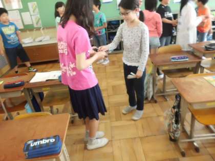 外国語活動ではあいさつをして,名刺を交換する活動をしました。「Hello!」や「My name is ○○」など英語での会話をしながら,たくさんの人と名刺を交換していきました。