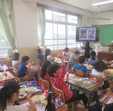 給食にほうれん草ともやしのごま煮がでてきました。給食室からこんにちはでは,ほうれん草はどっちかなのクイズがありました。最初は,葉っぱ,次は根元,そして最後に全体を見て答えました。ほうれん草は,おなかのそうじをする「食物せんい」が多くふくまれていて,ヨーロッパでは,「胃腸のほうき」といわれているそうです。