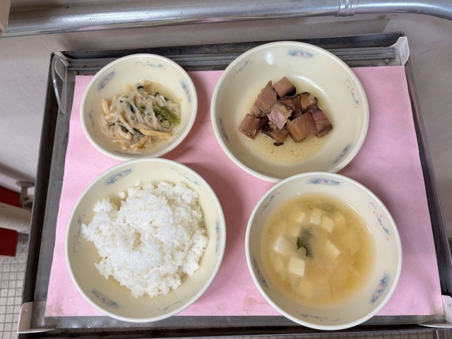 今日は4月の和食推進の日「和(なごみ)献立」で、ごはん、なま節のしょうが煮、切干大根の煮つけ、みそ汁でした。