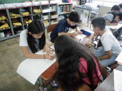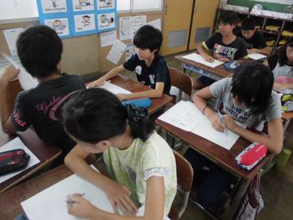 図工科の学習では,お話の絵を描き進めています。二組は「ときめき団地の夏祭り」という作品で,縁側や土管,ハナミズキなどキーワードになるものや,お祭りらしい神輿やハッピを描くのに苦戦中です。
