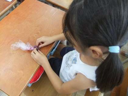 生活科で育てたあさがおの花を使って,色水あそびをしました。