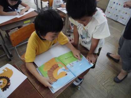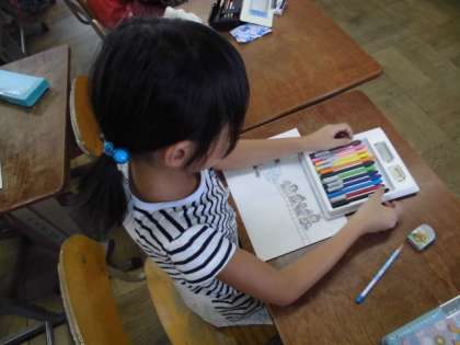 どちらのクラスも,お話を聞いて,いろいろな本やイラストを参考にしながら,どんな絵にしようか一生懸命に考えています。