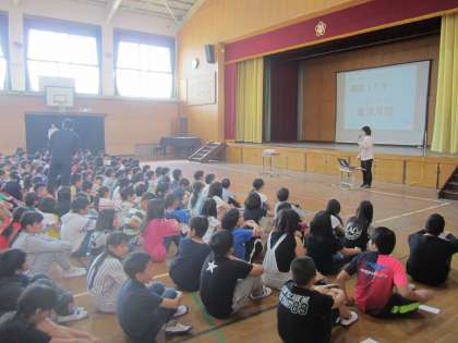校長先生から憲法のお話と,学校教育目標・各学年の目標を聞き,いじめ0の学校を目指すためにはどうすればよいかを考えました。