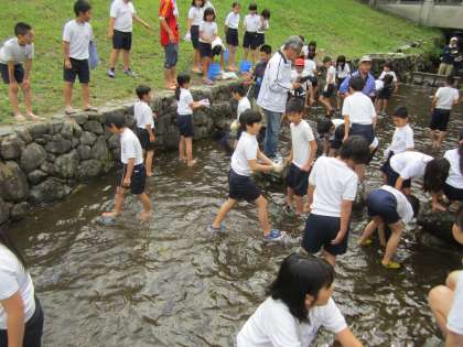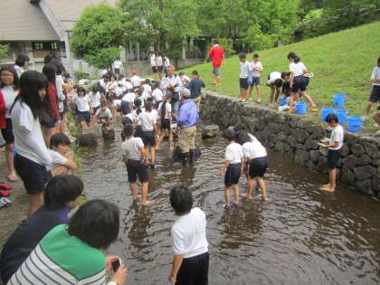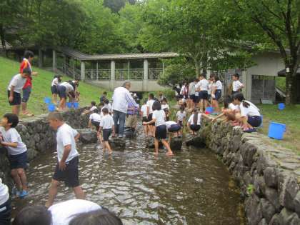 その後、『オガマ池』 で魚つかみをしました。山水のため冷たい水に足を入れると、思わず「冷たい〜。」と声が上がっていました。でも、すぐにすばやく逃げる魚を追いかけていました。魚があまりに速く泳ぐので、なかなか捕まえられなかったり、捕まえてもヌルヌルしていて逃げられてしまったりしていました。また、作戦を考えたり、友だちと協力したりしてワイワイ楽しそうに魚を追いかけていました。