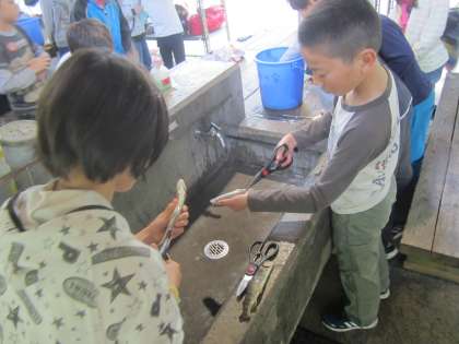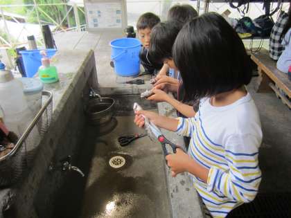昼食は魚つかみでつかまえた魚をさばいて、食べました。「命」をいただいているという気持ちをもって食べましょうという所員さんの話を聞いてから、魚をさばきました。塩焼きにした魚と一緒にお弁当を食べました。自分で捕まえた魚はいつもよりもおいしいという子もたくさんいました。