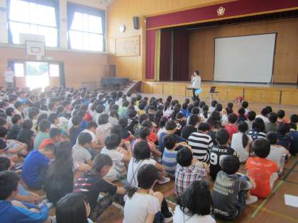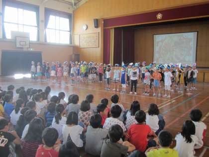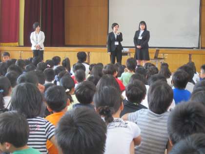 次に,この日から4週間,本校で教育実習を受ける2人を全校児童に紹介しました。主に4年1組と5年2組で過ごすことになりますが,2人には,祥栄の児童とたくさんふれ合う中で多くを学んでいってほしいです。