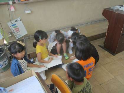 今,「お手紙」の音読劇にむけて班に分かれ,